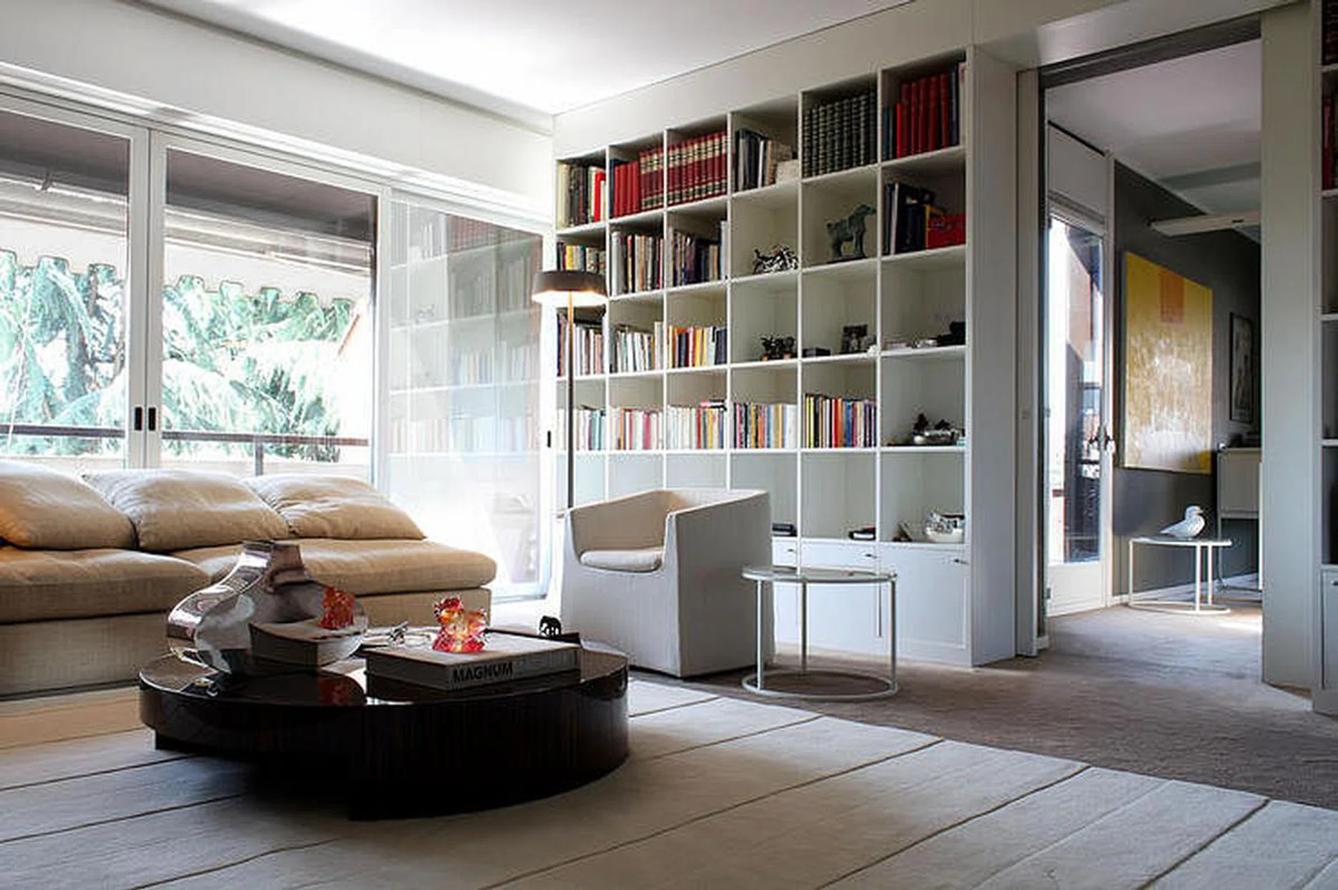 The spacious living room has a light colour palette, allowing interesting pieces of furniture and decor in the bookshelf to stand out. Natural light floods through floor-to-ceiling windows, dancing across carefully curated surfaces and highlighting the delicate balance between contemporary minimalism and Eastern design sensibilities.