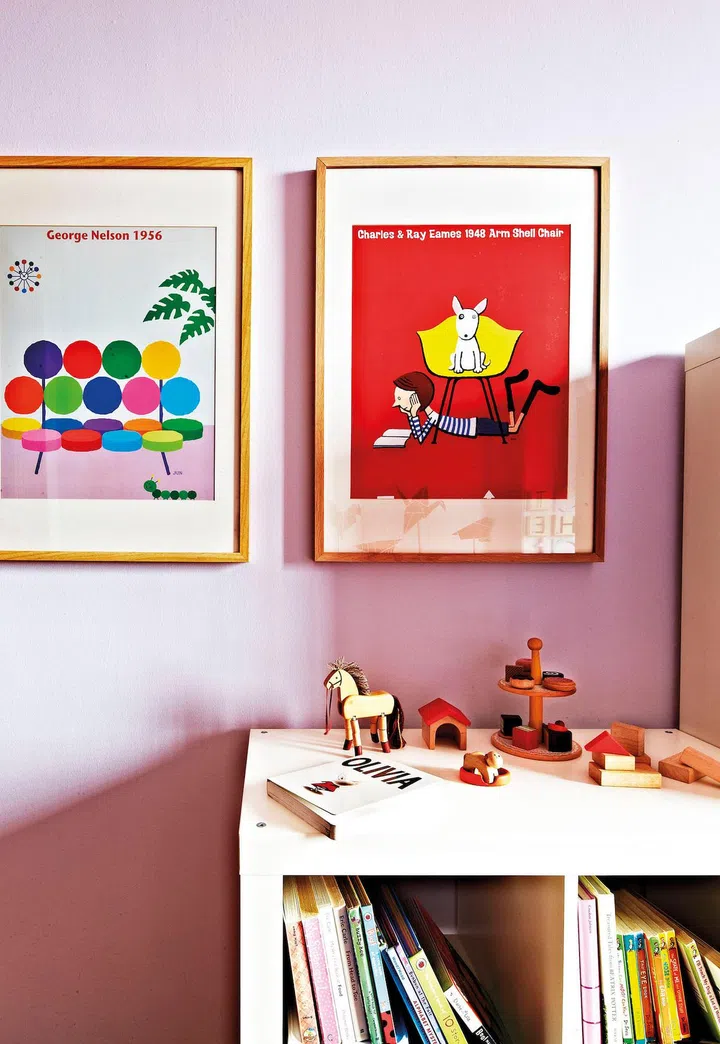 The homeowner bought these Eames prints, on the walls of her girls' room, from Osaka even before she had her kids.