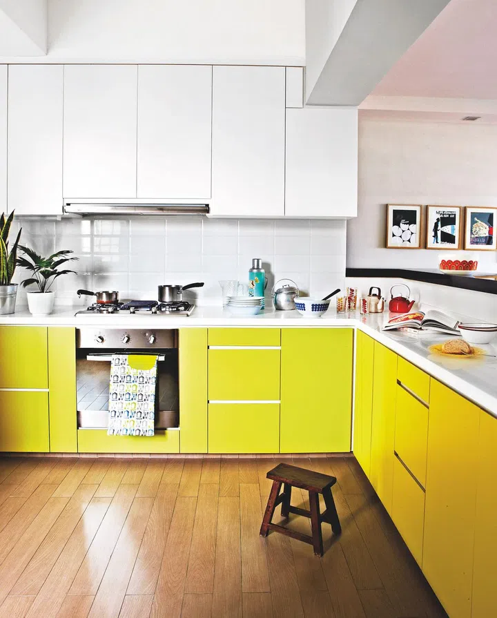 Yee Foong wanted a specific laminate colour for the kitchen cabinets – “this is the shade of green reminscent of my childhood,” she says. The flooring is wood-lookalike tile.