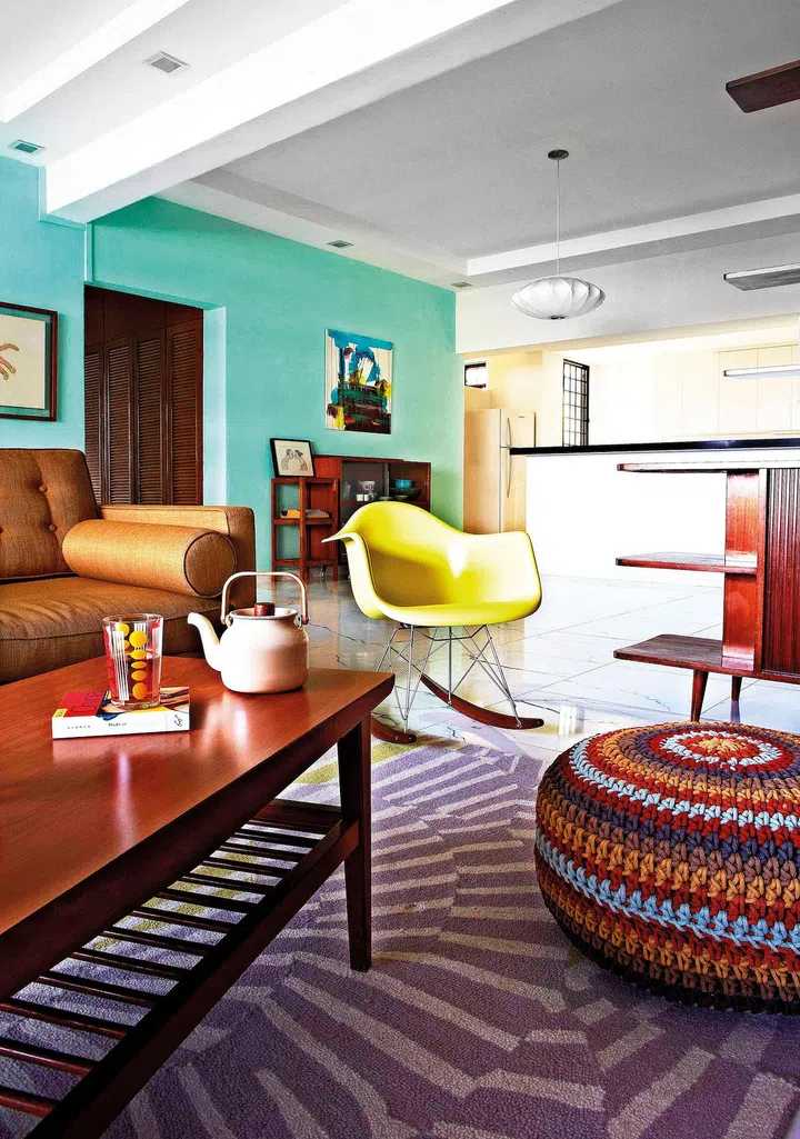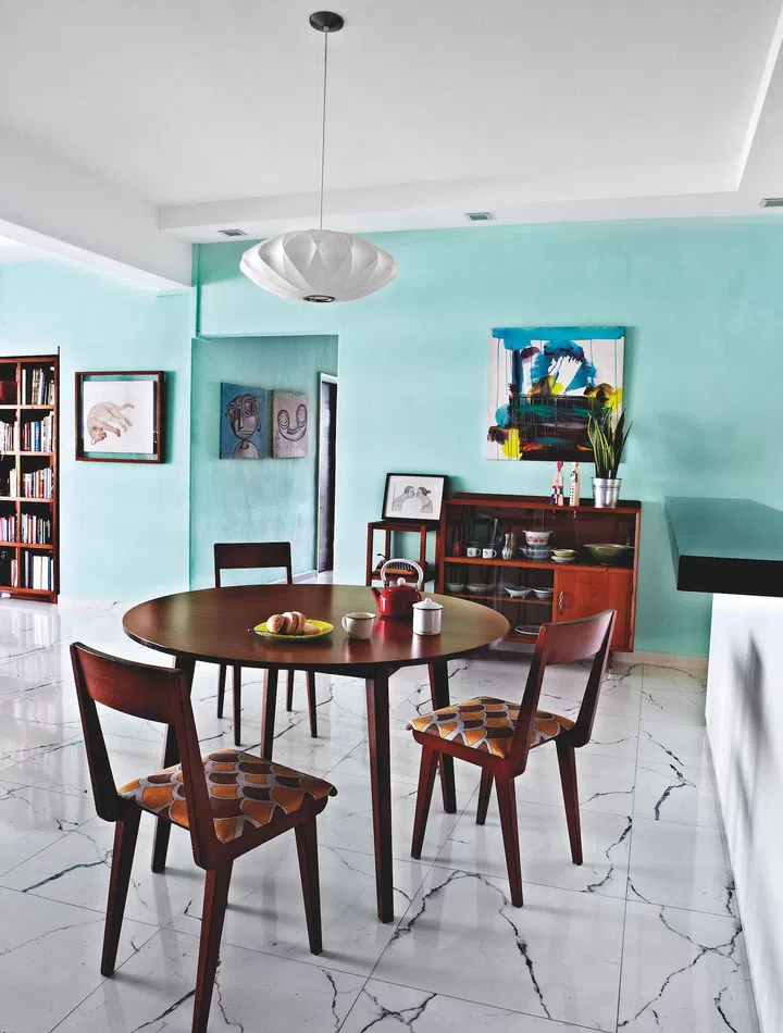 The seafoam-blue in the living area as a colour phase she went through, says the homeowner. As a child, she used to eat at this dining table, which at the time belonged to her grandmother.
