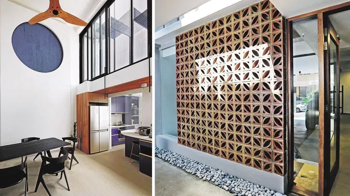A small bathroom is partially hidden by a wall of ventilation blocks, to allow for some breeze and light to enter while ensuring privacy. The double volume dining area sits next to the kitchen on the second floor.