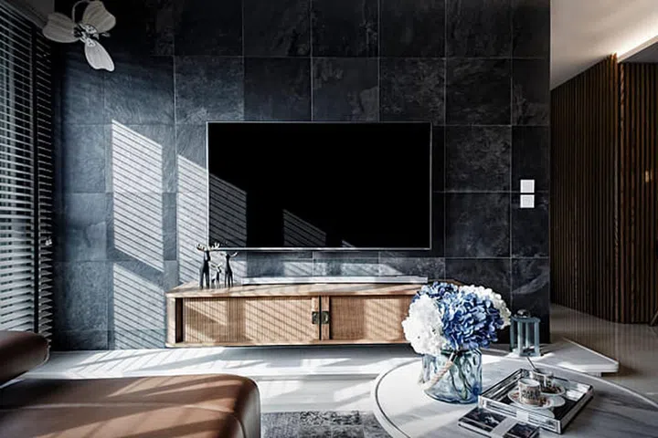 Stone tiles clad the entire wall behind the TV console for a textural look that pairs perfectly with wood-look elements in other parts of the home.