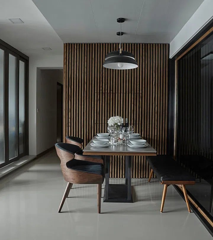 A wood-look panelling design clads the wall alongside the dining area to add visual interest and the illusion of a higher ceiling. Furniture with wood accents were chosen to complement this space.