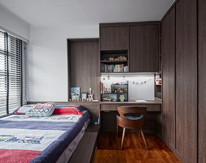 in the bedroom, dark wood-look laminate were chosen for the cabinetry. To make full use of floor space, a study was incorporated with the wardrobe.