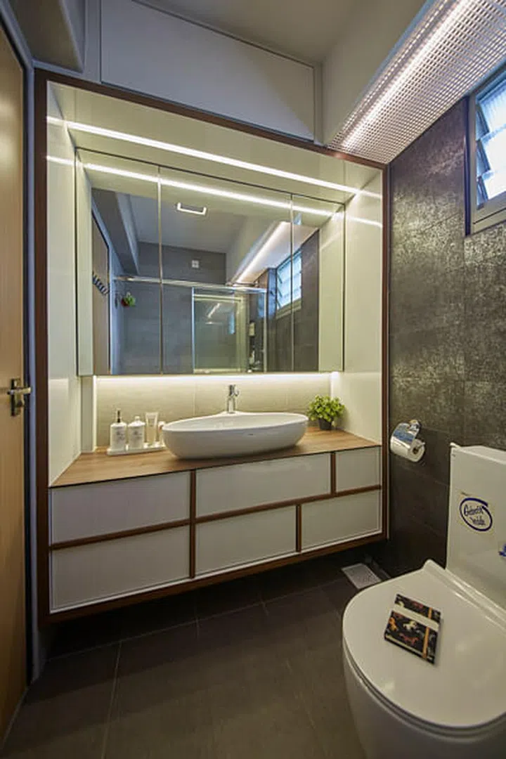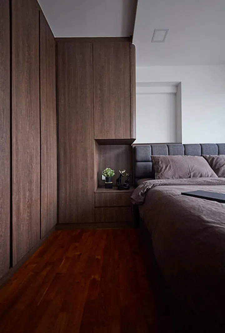 For the master bedroom, instead of a bedside table, a "cut-out" nook was incorporated into the wardrobe design for the homeowners' knick-knacks and accessories.