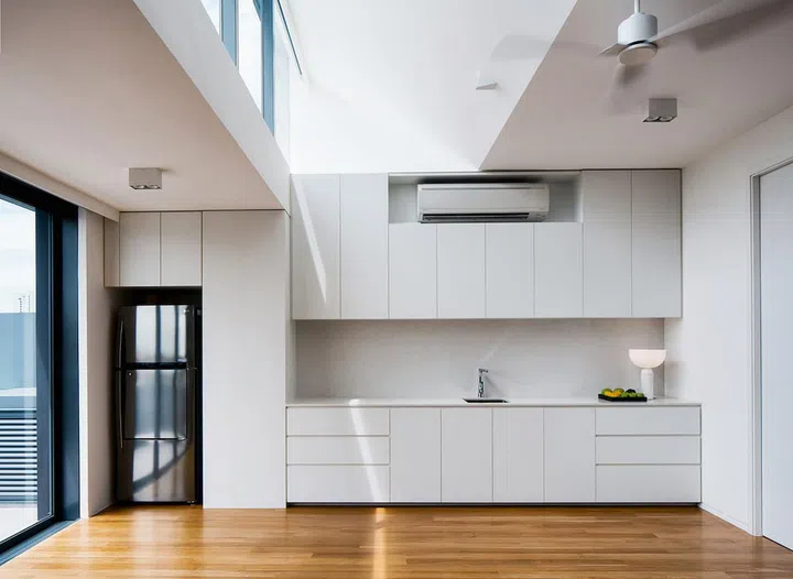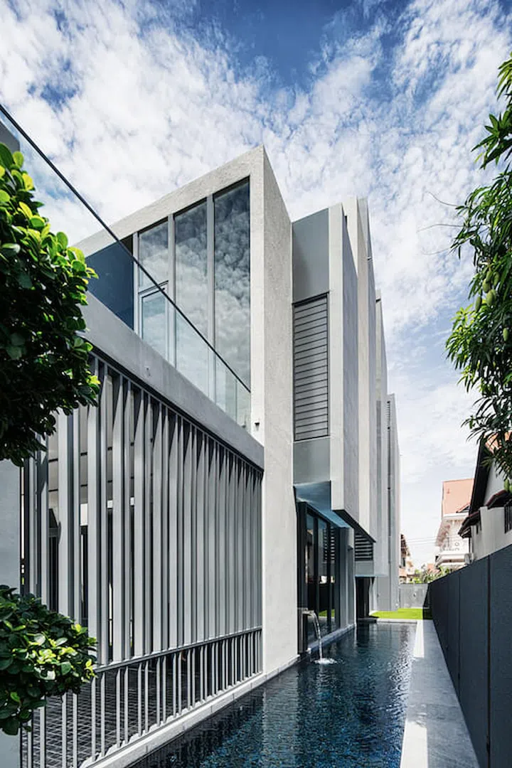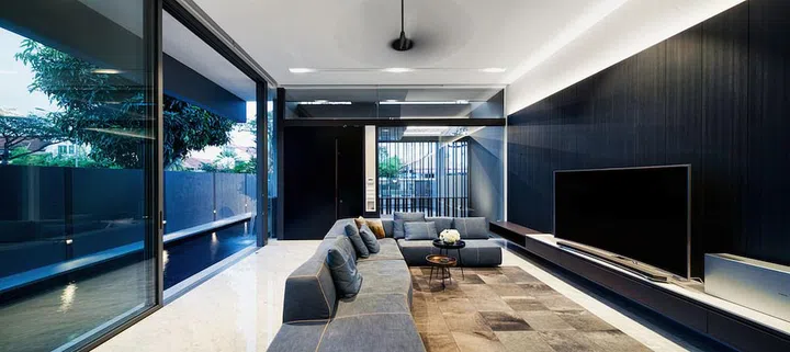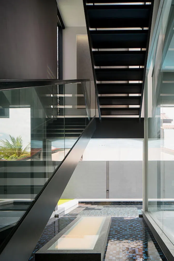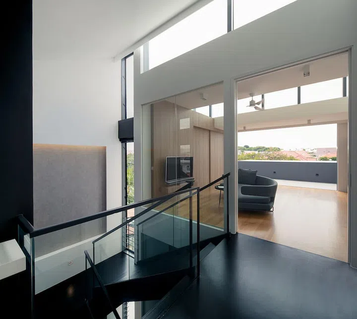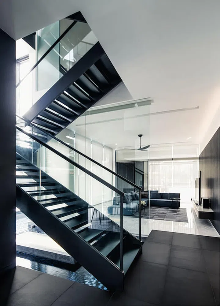 At the same time, the family also asked for a 3-metre wide lap pool to be created on one side of the home. While this took up space on the ground level, the design team decided to extend the upper floors outwards so that they could still carve out more space above the pool. These extensions also allowed the design team to create more openings to allow for ventilation and light to fill the interiors.