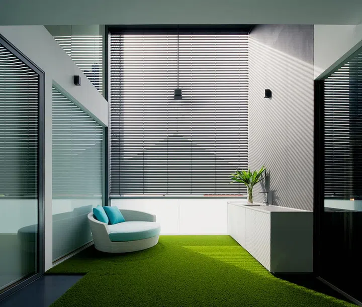 A motorised blind ensures that the area can be closed off from prying eyes of the neighbours when necessary.