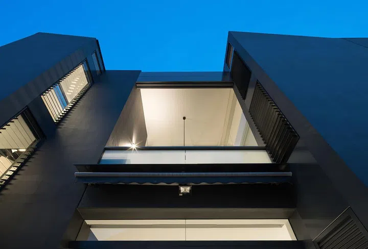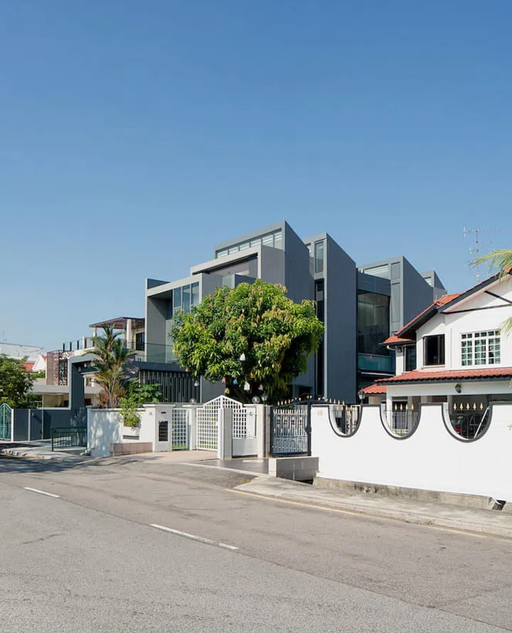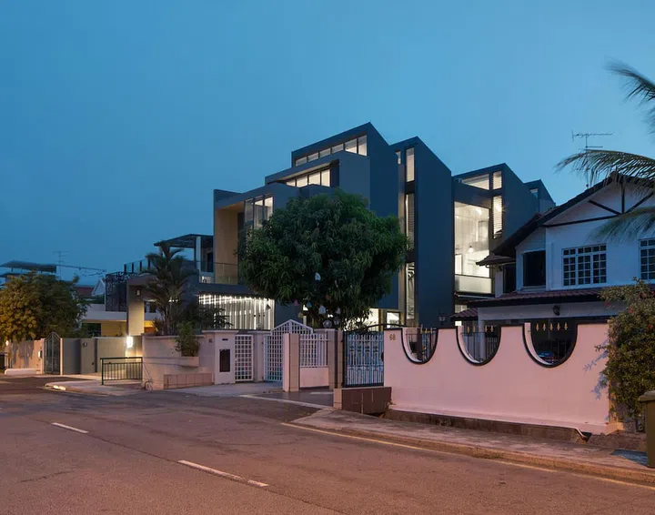 Coated in dark colours, the home’s exterior stands out prominently from its neighbours.