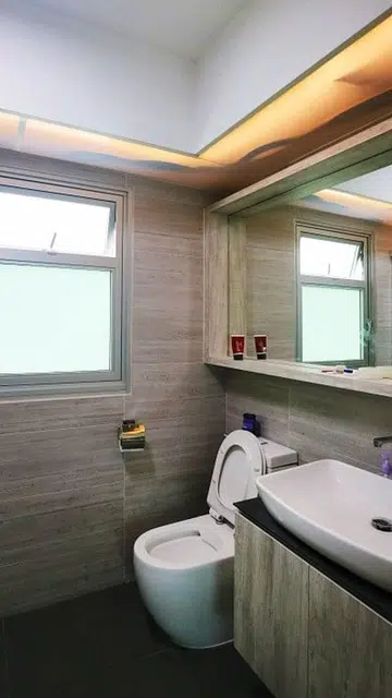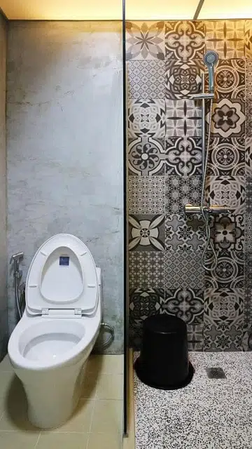 True to its industrial roots, the master bathroom showcases beautiful concrete screed finishes, but with a twist. The addition of bold Peranakan-patterned tiles in the shower area creates a stunning fusion of industrial and heritage elements. This creative mixing of styles gives the space a unique personality that sets it apart from typical industrial bathrooms.
