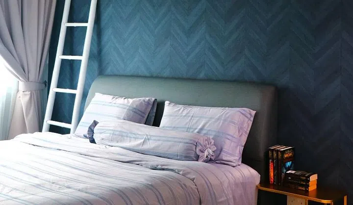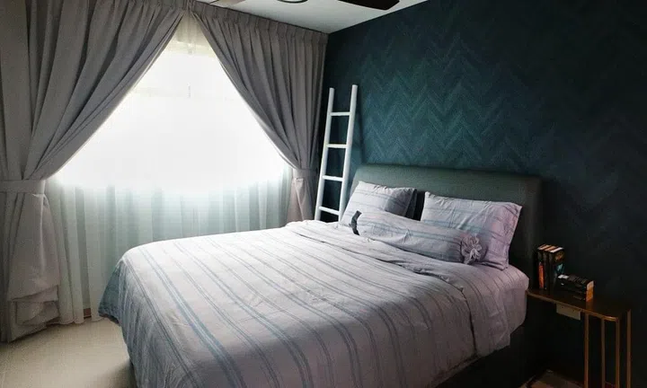 In the master bedroom, the industrial style HDB hometakes another unexpected turn with a stunning turquoise chevron-patterned feature wall. This bold choice demonstrates how industrial interior design can incorporate softer elements without losing its essential character. The result is a personal sanctuary that feels both edgy and inviting.