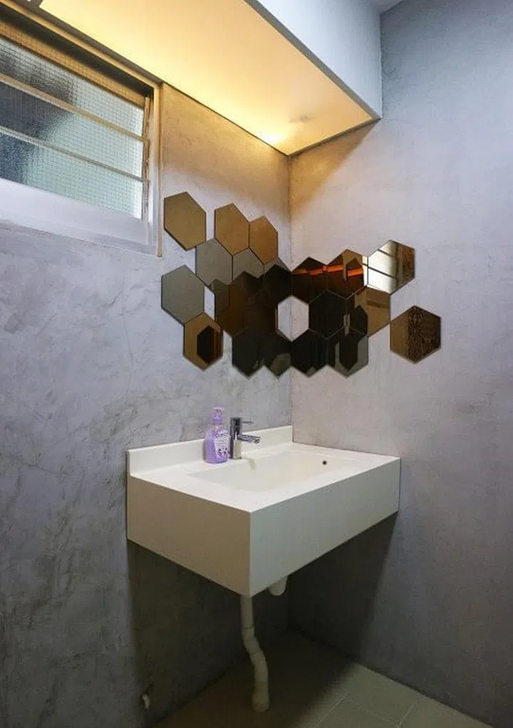 A captivating collage of hexagonal mirrors serves as both functional element and artistic installation, adding another layer of visual interest to the thoughtfully designed space. This geometric pattern play reinforces the home’s contemporary industrial aesthetic while serving practical needs.