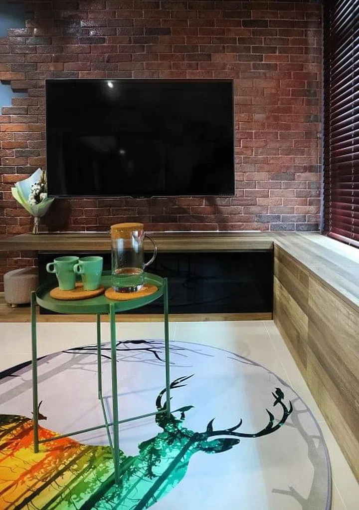 The heart of this industrial HDB comes alive in the living room, where a masterfully crafted faux brick wall sets the stage for the home’s unique character. Here, clever space planning reveals itself in the seamless integration of storage and entertainment areas.