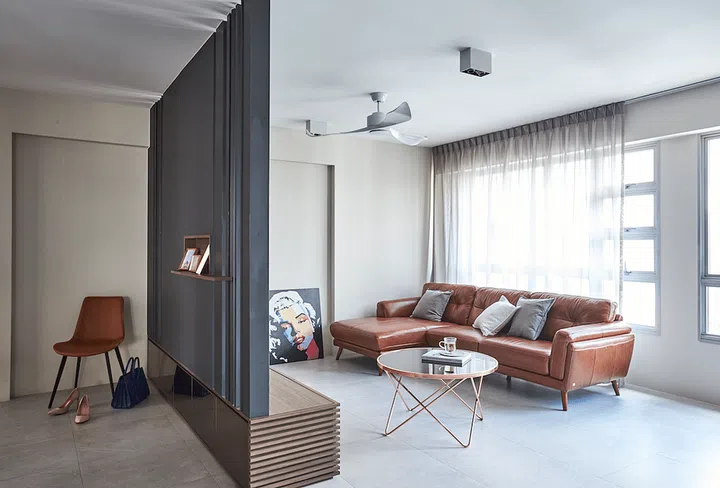 Interior designer Cadine created a privacy divider that demarcates the living area and the foyer. It also serves as the backing for a television console on one side, and incorporates an inviting display space on the other.