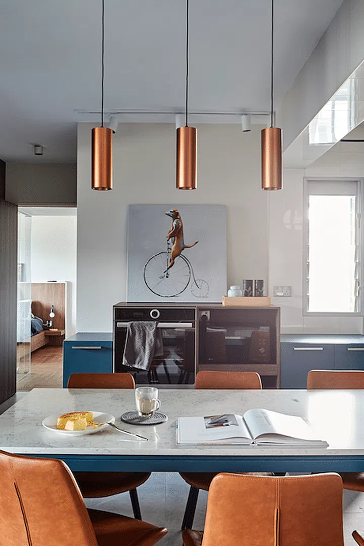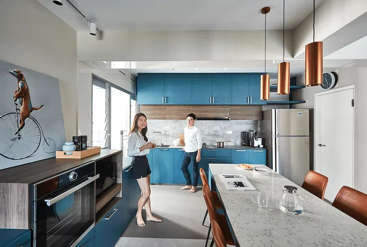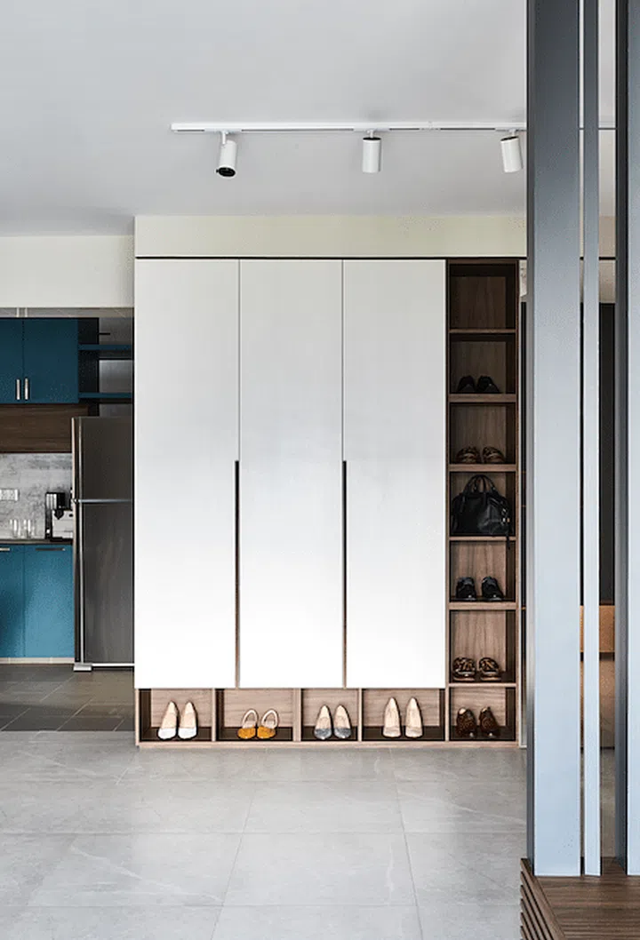 The couple worked with Cadine to design a contemporary-style home which features a dark teal laminate, a customised table for six with a marblelook quartz top, and a mix of closed and open cubbies in the foyer. This ensures additional storage does not look too “boxy”, while allowing hints of colour to come through, as well as giving easy access to frequently worn footwear.