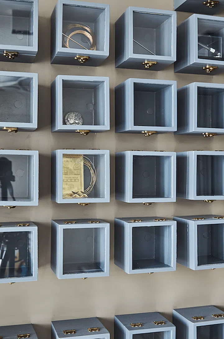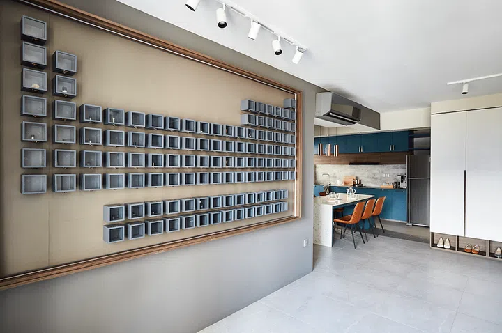 The couple had requested their interior designer, Cadine Lim of Prozfile, to create a physical manifestation of the periodic table. The display is made up of 118 square boxes with clear acrylic doors.