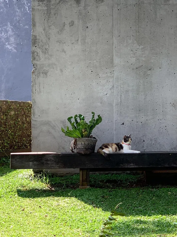 Located in Bintaro, south of Jakarta, the three-storey house occupies a 320-sqm trapezoidal and sloping plot. It is home to Andra, his interior designer wife Dite, their three children, and dozens of cats. Before the pandemic brought the world to a standstill, it was one of the famous hang out spots of Jakarta's creative community. Andra's eponymous practice andramatin studio is just a few doors down from the house, and his 30-odd staff members often came over for discussions and brainstorming.