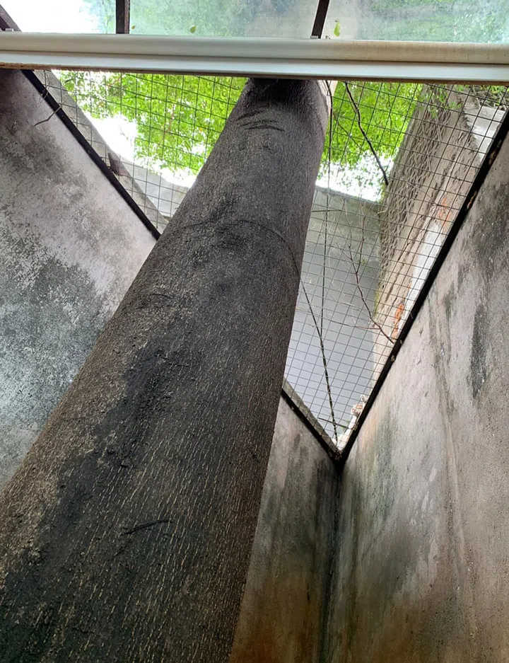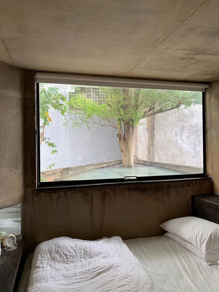 View of the tree from the master bathroom. The rain is allowed to pour inside to nourish the tree.