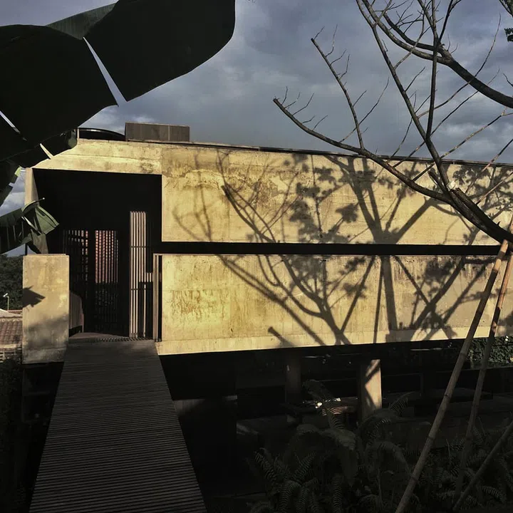 Seen from the main road, the house's raw aesthetic sometimes leads passersby to dismiss it as an abandoned construction. But this brutal exterior hides a warm home that embraces nature and offers a unique and cinematic spatial experience.