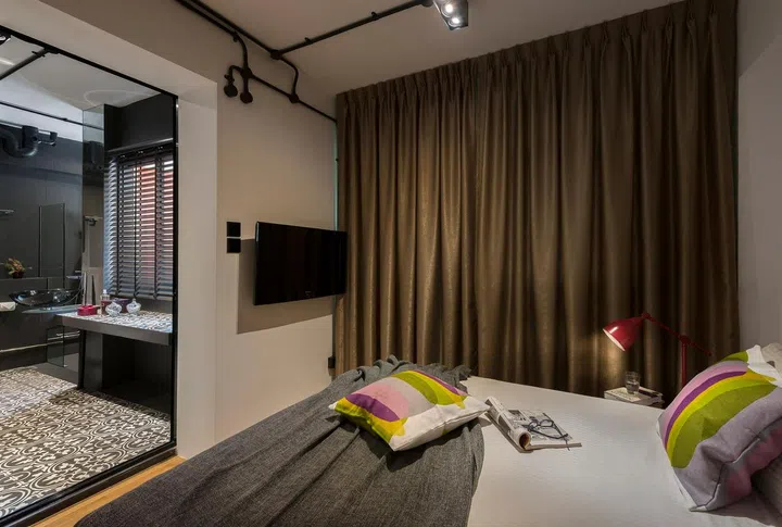 The wall between the bathroom and bedroom is replaced with an aluminum framed glass to open up both spaces for a seamless look.