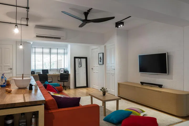 As the couple does not do heavy cooking, having a fully open kitchen was not a major issue. Square white tiles with dark grouts make the backsplash an eye-catching feature wall too.