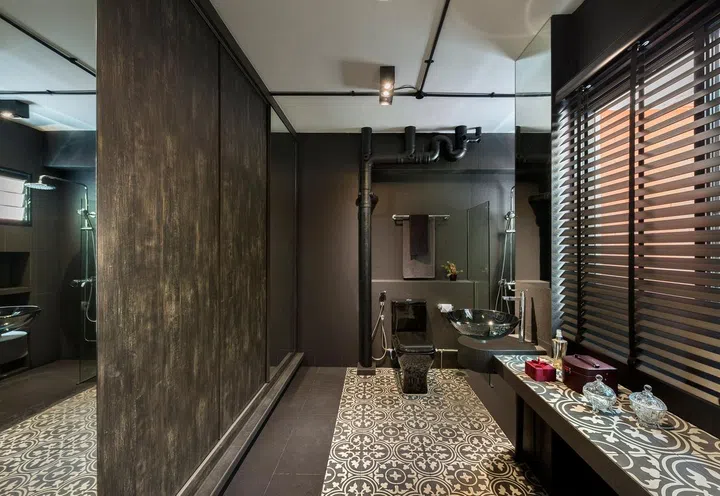 The master bathroom has a darker colour palette, chosen to complement the monochromatic Peranakan-inspired patterned tiles. This spacious bathroom has been reconfigured to lend additional floor space from the original master bedroom.