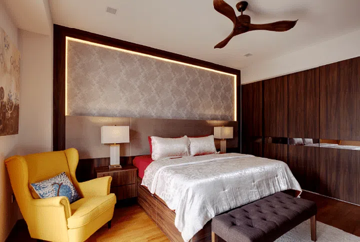 The master bedroom wall is cladded in a cream paisley wallcovering. Chris also created an inviting environment with plenty of ambient lighting, be it in display cases or those mounted on the staircase.