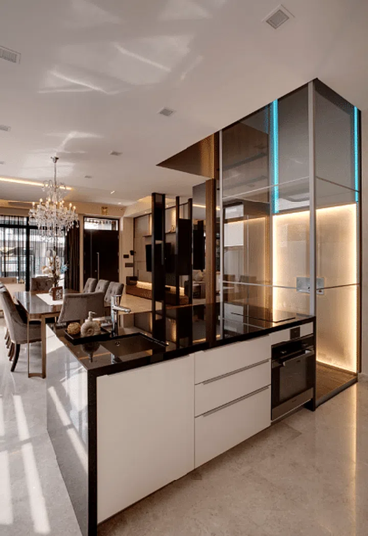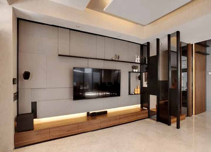 Quintessential to the modern contemporary look are linear designs and motifs, through the use of a privacy divider between living and dining rooms, as well as storage spaces with angular designs.