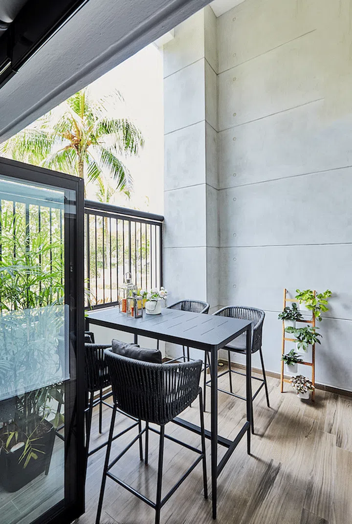 The wet kitchen opens onto a terrace with a beautiful view of Tampines River and the park connector. With just some plastering of the walls and a set of table and high stools, Tammy created another simple, yet cosy, chill- out space for the family. The terrace is also linked to the living room, and the latter’s palette of blacks, greys, whites and browns was exactly what Jonathan, Jeric and Xavier wanted.
