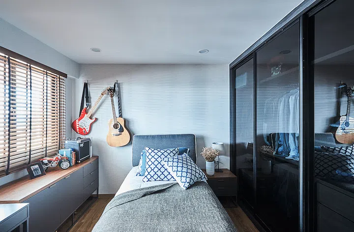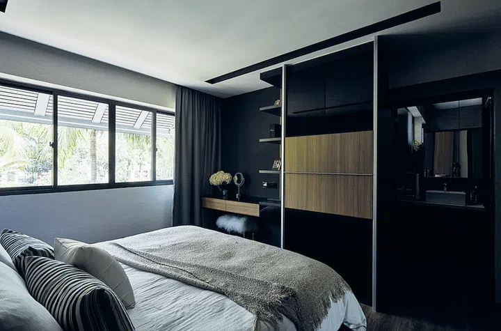 The master bedroom shares the same lovely view as the terrace. Its dark colours evoke relaxation and a sense of quietness. With some clever space planning, Tammy managed to carve out sufficient space to fit in a set of wardrobes, a dressing table and other storage spaces.