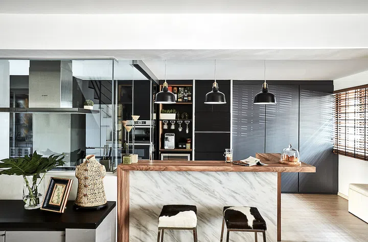 The small space between the main entrance and staircase has been transformed into a cosy dining area, complete with a wooden table and bench, and a pair of black, high-backed chairs. A sliding glass door between the dry and wet kitchens was erected, so that the grease and smoke from cooking can be contained. A marble and wood counter in the dry kitchen is not only visually pleasing, but it also provides the perfect spot for the rest of the family to hang out whenever Xavier demonstrates his culinary skills.