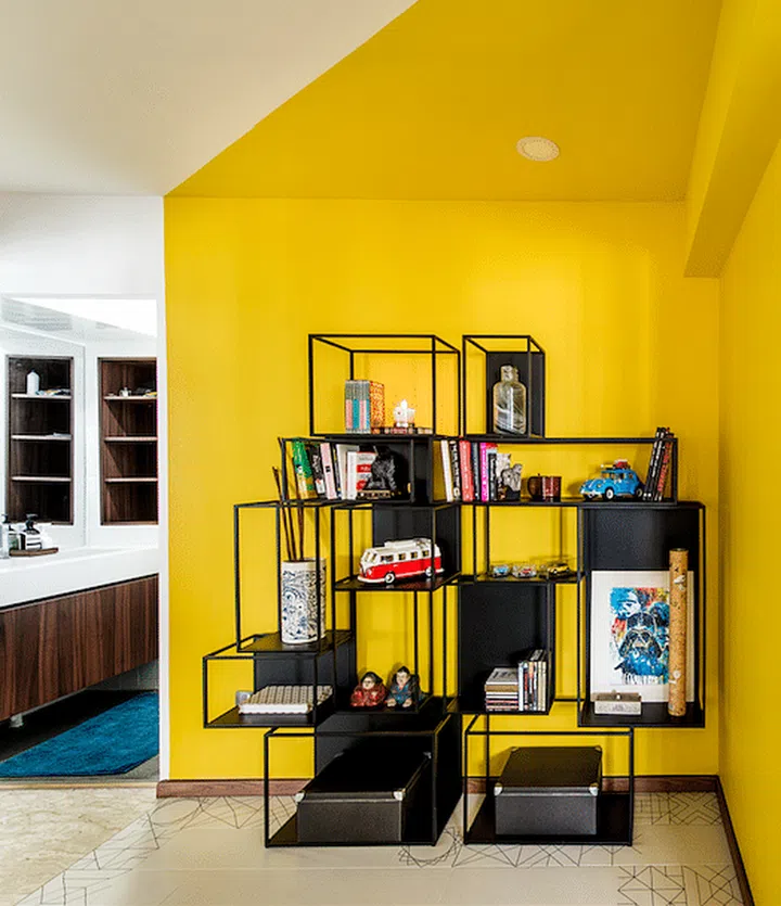 Part of the original walk-in wardrobe in the master bedroom was also carved out and turned into a display corner with a bright, egg yolk backdrop.