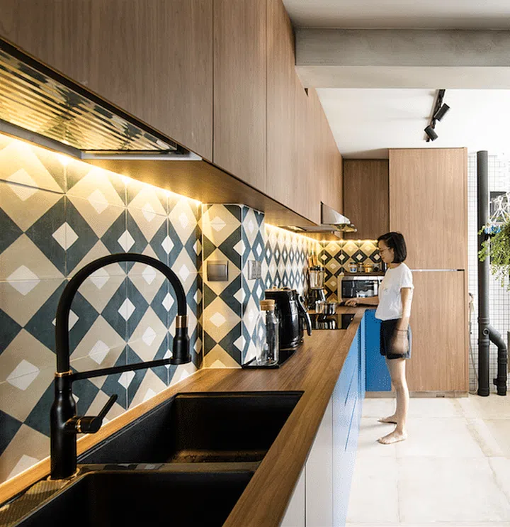 For a pop of colour, kitchen cabinets are in Scandinavian blue and the kitchen backsplash is covered in geometric tiles.