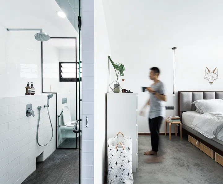 Even the bathrooms are kept simple with glass partitions for the shower areas, accented with an aluminium rim spray-painted in black.”