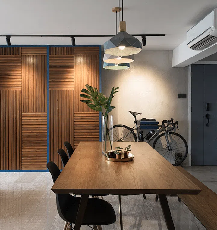 A cement wall acts as a subtle divider between the entrance foyer and the living space, and also doubles as an area for the owners to mount their bikes.