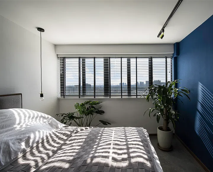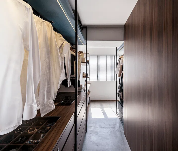 Behind the bold blue wall lies a walk-in wardrobe with customised compartments and drawers to keep accessories in place.