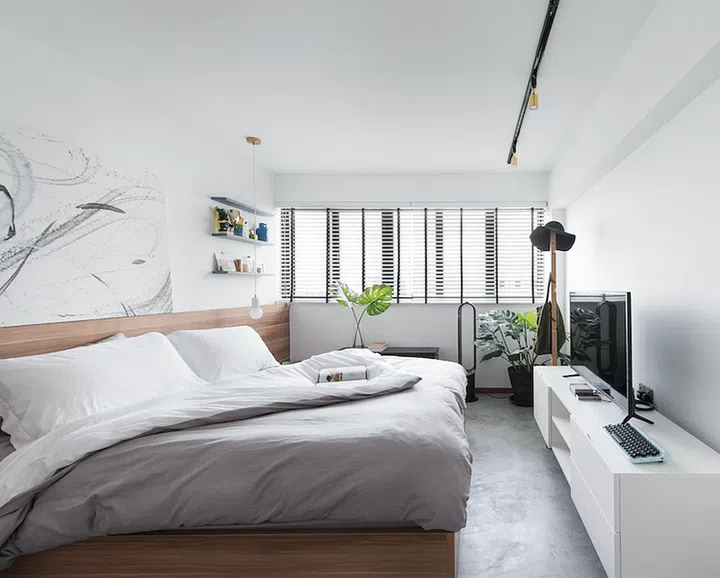 The second bedroom is more discreet in style, with basic raw touches such as wood and cement for a restful environ. The only dramatic element is the row of gold-toned track lights on the ceiling.