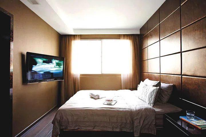 There was no room for even a narrow shelf at the foot of the bed, so Adrean built the storage niche for the DVD player and cable set-top box into the wall, eating into space on the other side. Cushion from Ikea.