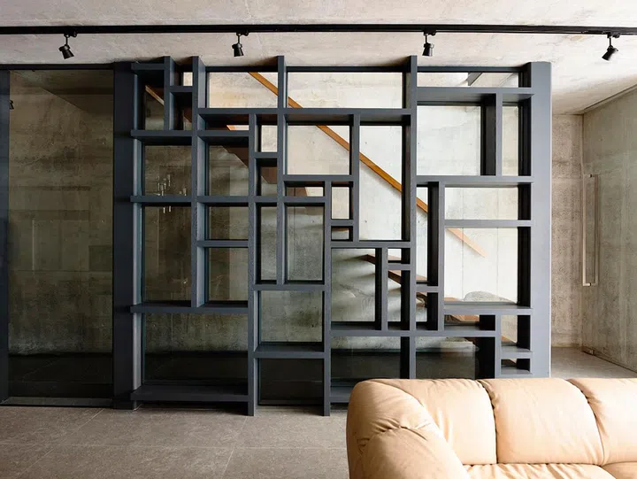 Along the side of the staircase on the first floor, display shelves are designed to offer storage space for the homeowners collection of books, decor accessories and other knick-knacks, which doubles as a feature wall too!