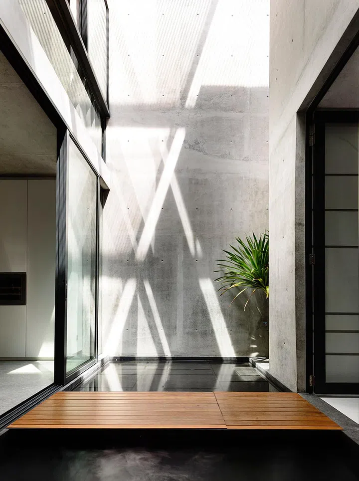 Having the pool in the middle of the house offers the opportunity of designing a skylight and airwell with enclosed glass and timber trellis at the top that allows natural light to fill the interior spaces across all floors.
