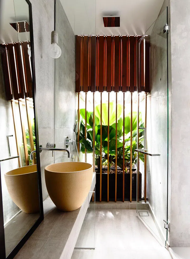 In one of the bathrooms in the house, the architect added greenery along the shower area for privacy, while giving the space a calming and soothing ambience.