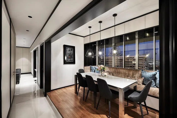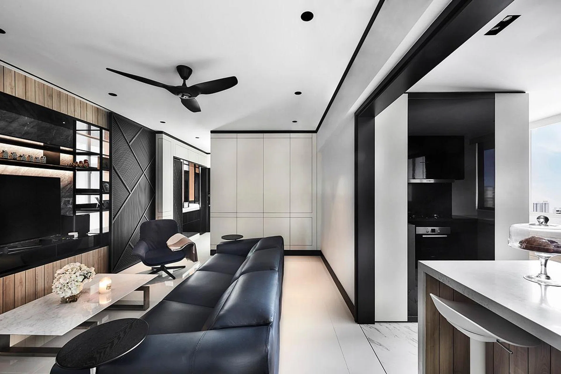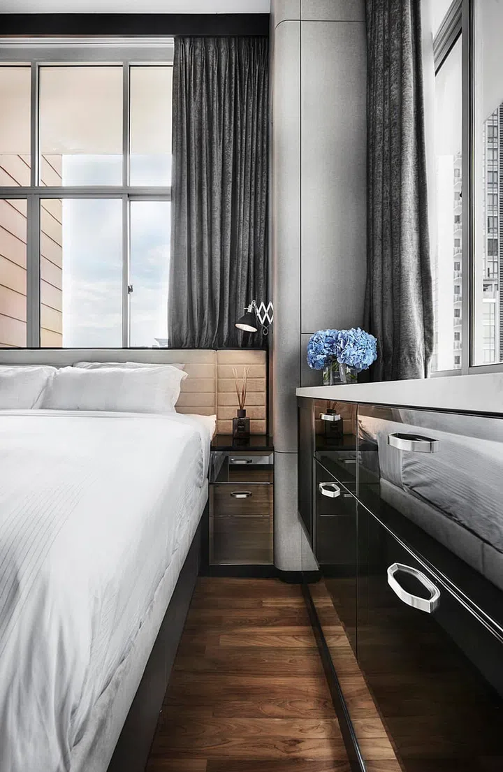“Bay windows lined the entire apartment - from the entrance to the living room, the bedrooms, and even the kitchen. So, one of our main design focus was to incorporate interior elements such as consoles, storage, counters, study desk and even a bed over the bay window ledges in order to reclaim precious real estate,” says Lawrence.