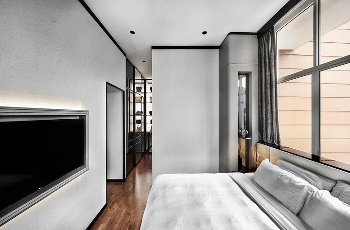 Interior designer Lawrence erected cabinets parallel to the bed, in order to make use of the length of space in the corner column.