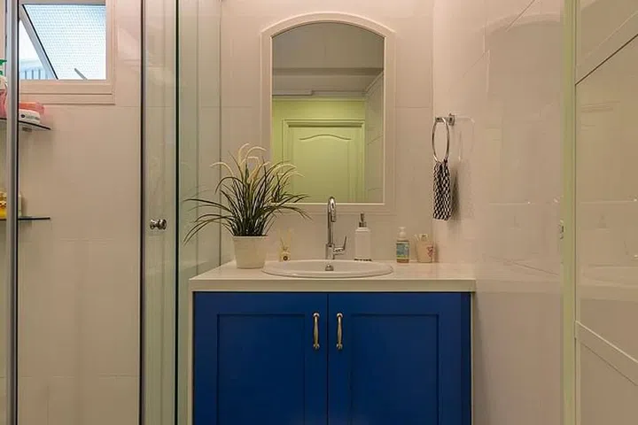 In the common bathroom, a strategic pop of blue injects energy into the space while maintaining the home’s overall design coherence. This thoughtful touch shows how even utilitarian spaces can contribute to the home’s preppy narrative.