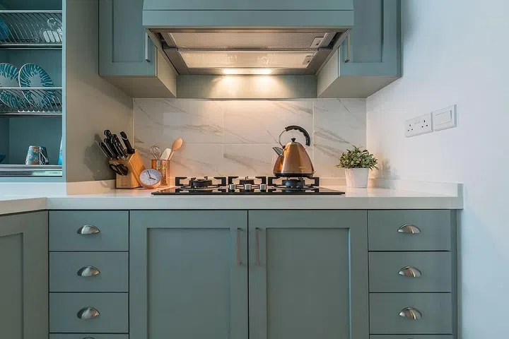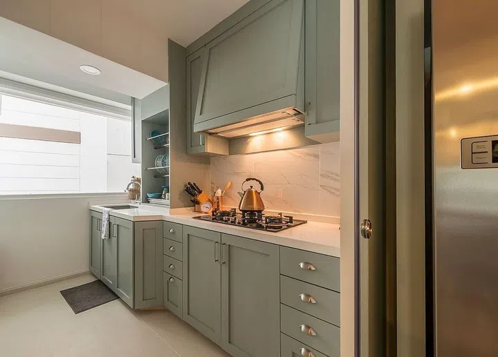 The heart of this preppy style HDB home lies in its dual-kitchen concept, a feature that demonstrates how modern HDB living can accommodate more elaborate cooking and entertaining spaces.