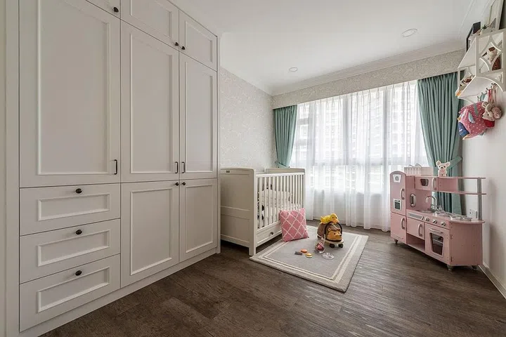 The children’s room exemplifies how the concept of practical luxury extends throughout the home. Tall white wardrobes maximize storage while maintaining an open feel, complemented by sheer day curtains that allow natural light to flood the space.