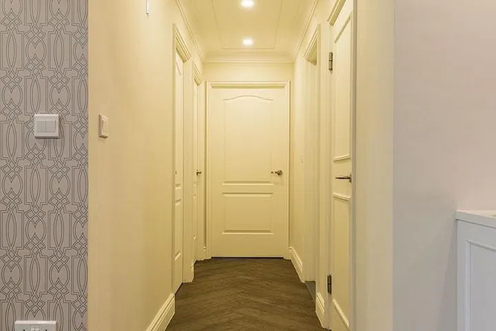 The master bedroom continues the home’s refined aesthetic with its own geometric wallpaper and wainscoted carpentry details, creating a cohesive design thread that runs throughout the preppy style HDB. These architectural details add character while maintaining the serene atmosphere essential for a restful bedroom.