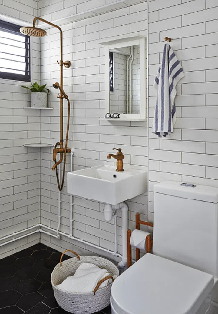 The same subway tiles on the backsplash were used in the bathroom, along with black hexagonal tiles for flooring (both from Hafary). The brass tones of a vintage-style, wallmounted shower ordered off Chinese shopping site Taobao make for a nice contrast against the clean palette. This thoughtful continuation of materials helps maintain design coherence throughout the Clementi HDB flat, while the mix of modern and vintage elements adds depth to the Scandi interior design scheme.