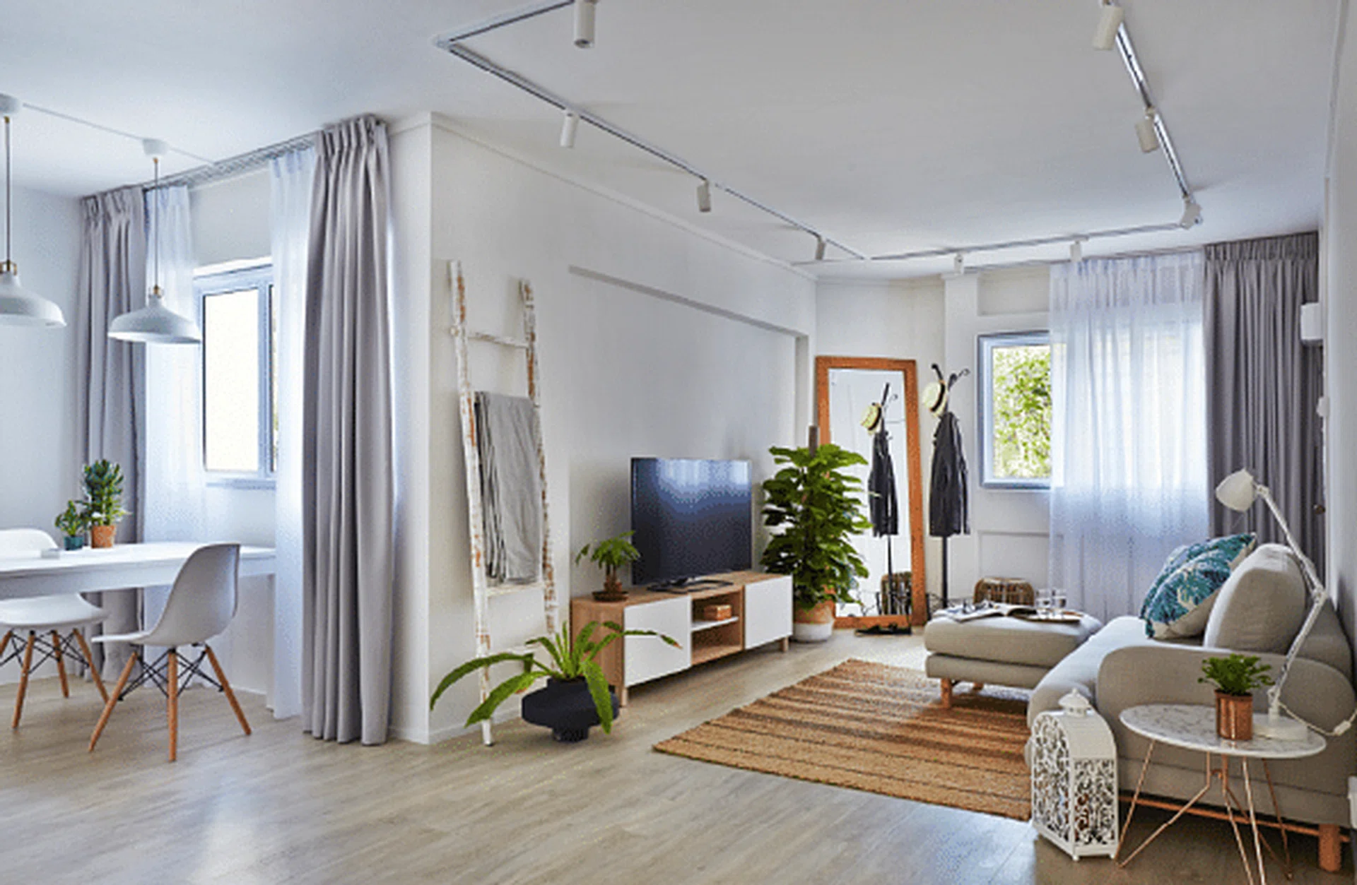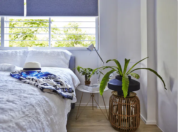 With white walls and light grey furnishings, as well as non-tinted windows, the home has light and bright spaces, personalised with accessories. The weathered wood ladder and jute carpet add a rustic charm, while the potted plants introduce nature to the living room. These thoughtfully chosen elements demonstrate how this Clementi HDB flat embraces key principles of Scandinavian interior design, where natural materials and textures play a crucial role in creating warmth within a minimalist framework.
