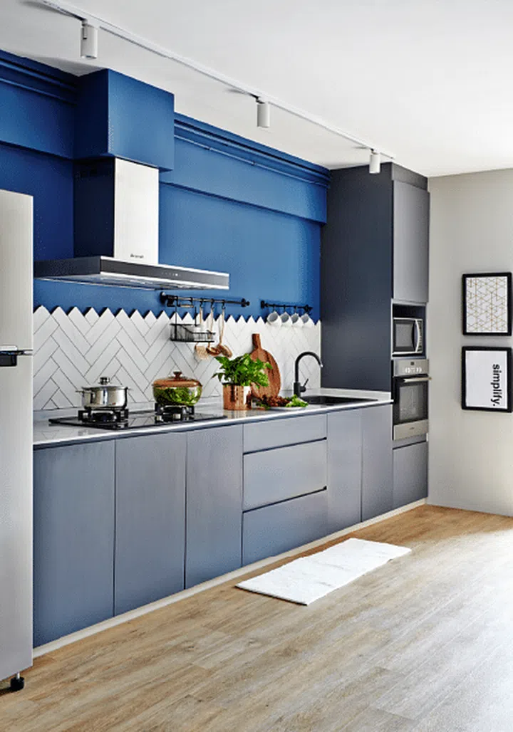 In the kitchen, the Three-D Conceptwerke interior design team paired vibrant blue paint with white subway tiles arranged in a herringbone pattern – a fun, yet chic, contrast against the sleek grey cabinetry, which was made with laminated solid plywood. This bold design choice shows how contemporary Scandinavian interior design can incorporate pops of color while maintaining its characteristic clean lines and functional beauty.