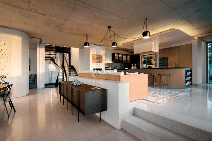 The combination of an open-concept kitchen counter and a sofa encourages uninhibited interaction between family and friends.